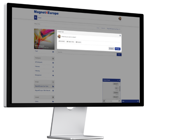 Easily share messages, files, images and workspace content in social network posts with other participants. Several socials networks can be activated simultaneously and access to them can be driven by data, roles or AI.